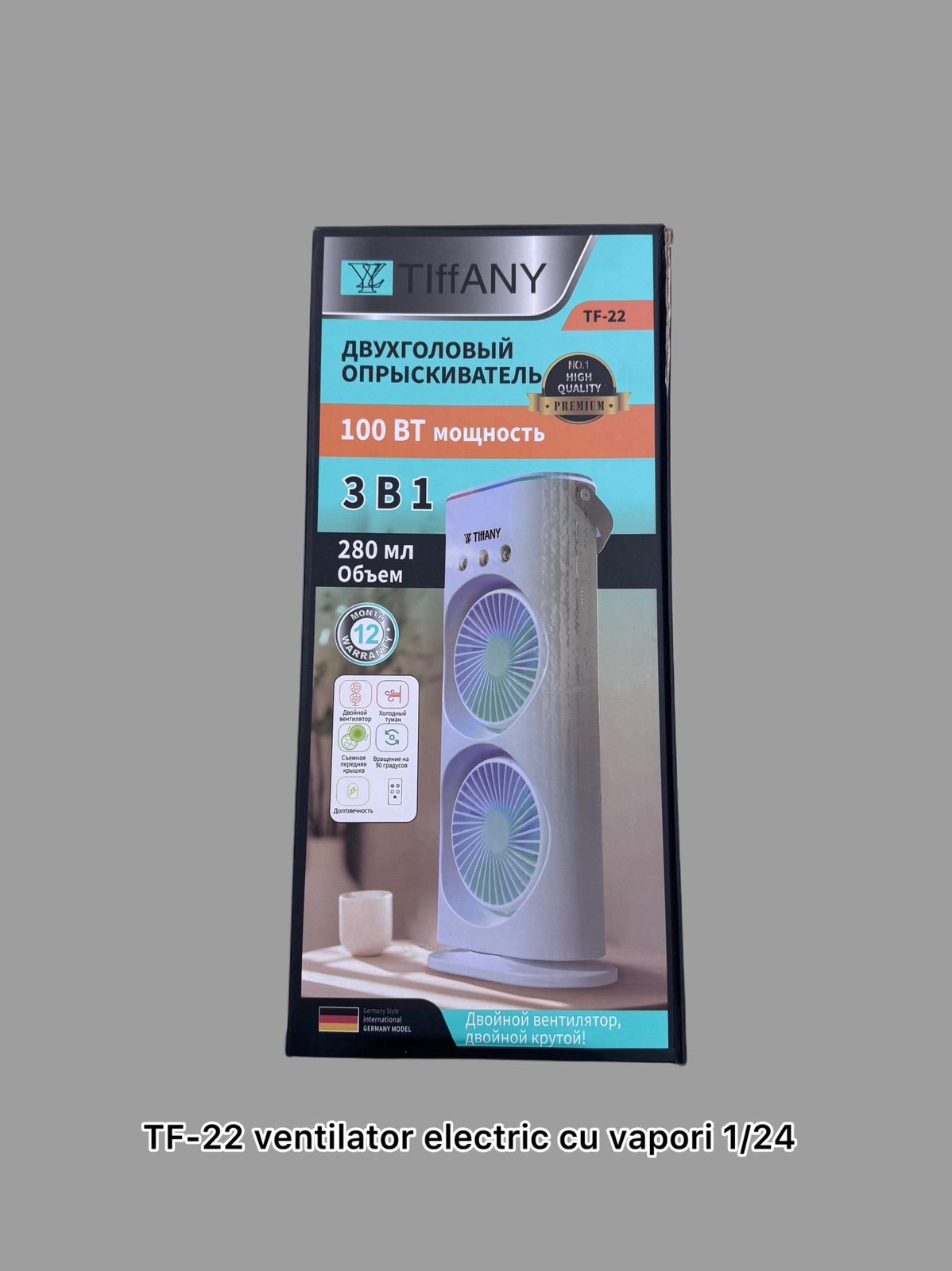 Putere: 100 W Capacitate rezervor: 280 ml Funcții: 3 în 1 (ventilator dublu, pulverizator, umidificator) Caracteristică: Ventilator dublu pentru un flux de aer îmbunătățit